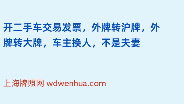 开二手车交易发票,外牌转上海沪牌(沪大牌),外牌转大牌,外牌过户换上海上海沪牌(沪大牌),外牌车主和上海沪牌(沪大牌)车主不是同一个人,两位车主也不是夫妻关系,二手车发票怎么开?外牌车怎么换成上海沪牌(沪大牌)呢?